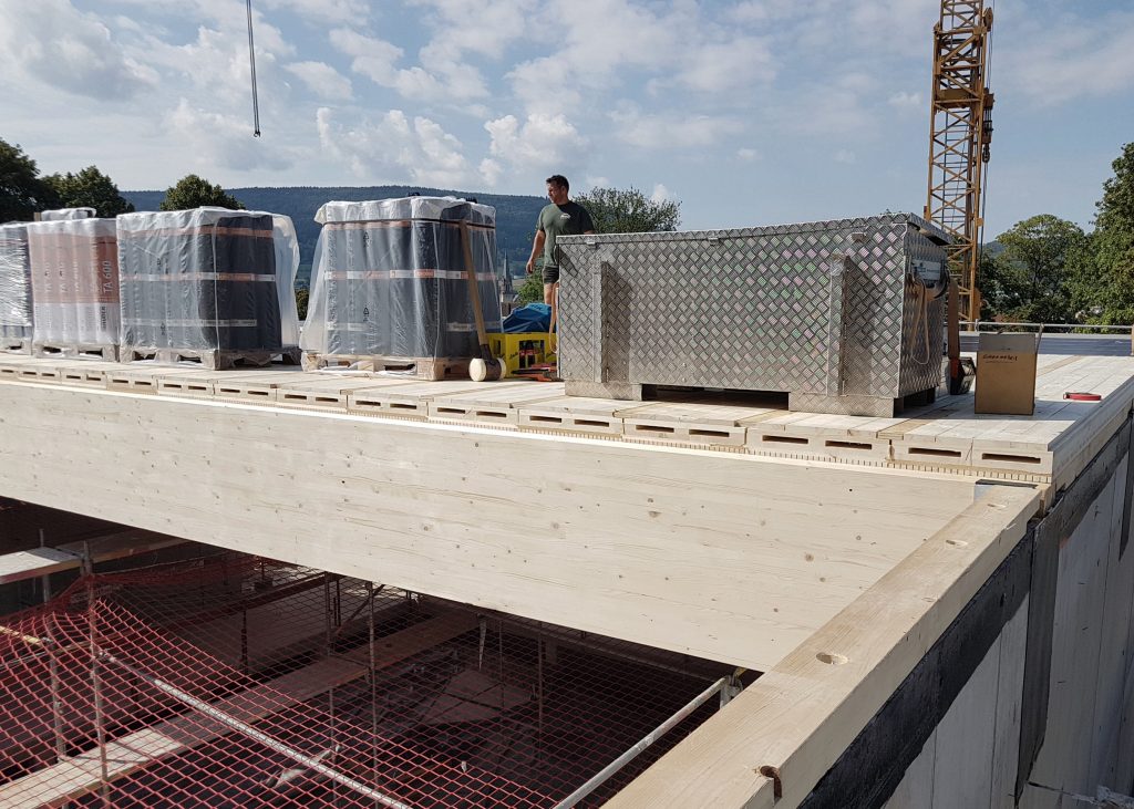 So funktioniert moderner Holzbau mit intelligenter Multifunktionalität: Die tragenden, formstabilen Holzdecken von LIGNO-TREND verbinden in nur einem Bauteil beste bautechnische Kennwerte mit hoher, ästhetischer Gestaltungsvielfalt. Hier erfolgt gerade die Montage des LIGNO TREND-Daches mit Fertigteilelemente auf unserer Baustelle am Lehrschwimmbecken in Spaichingen.