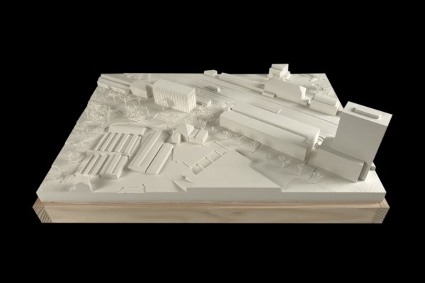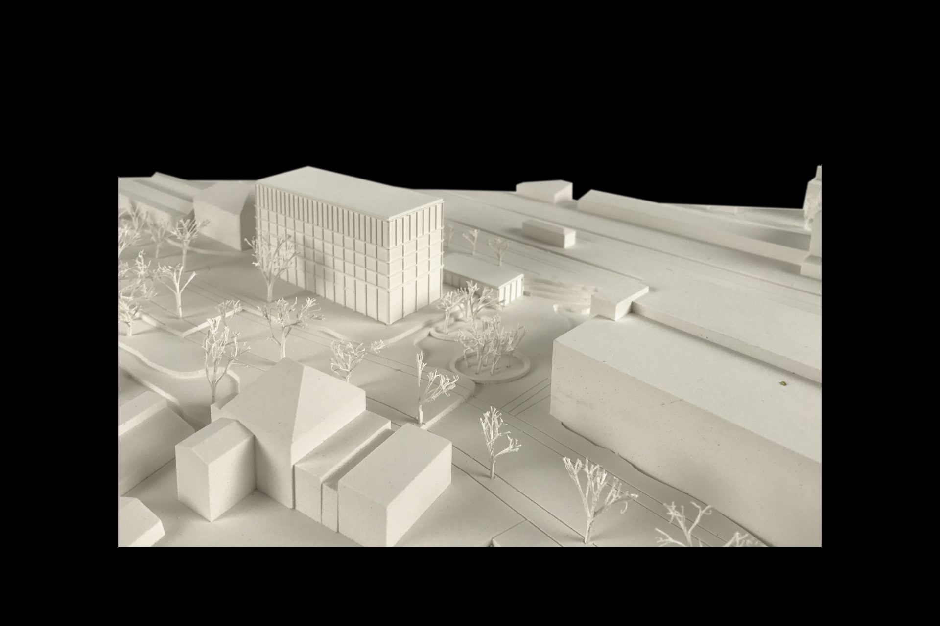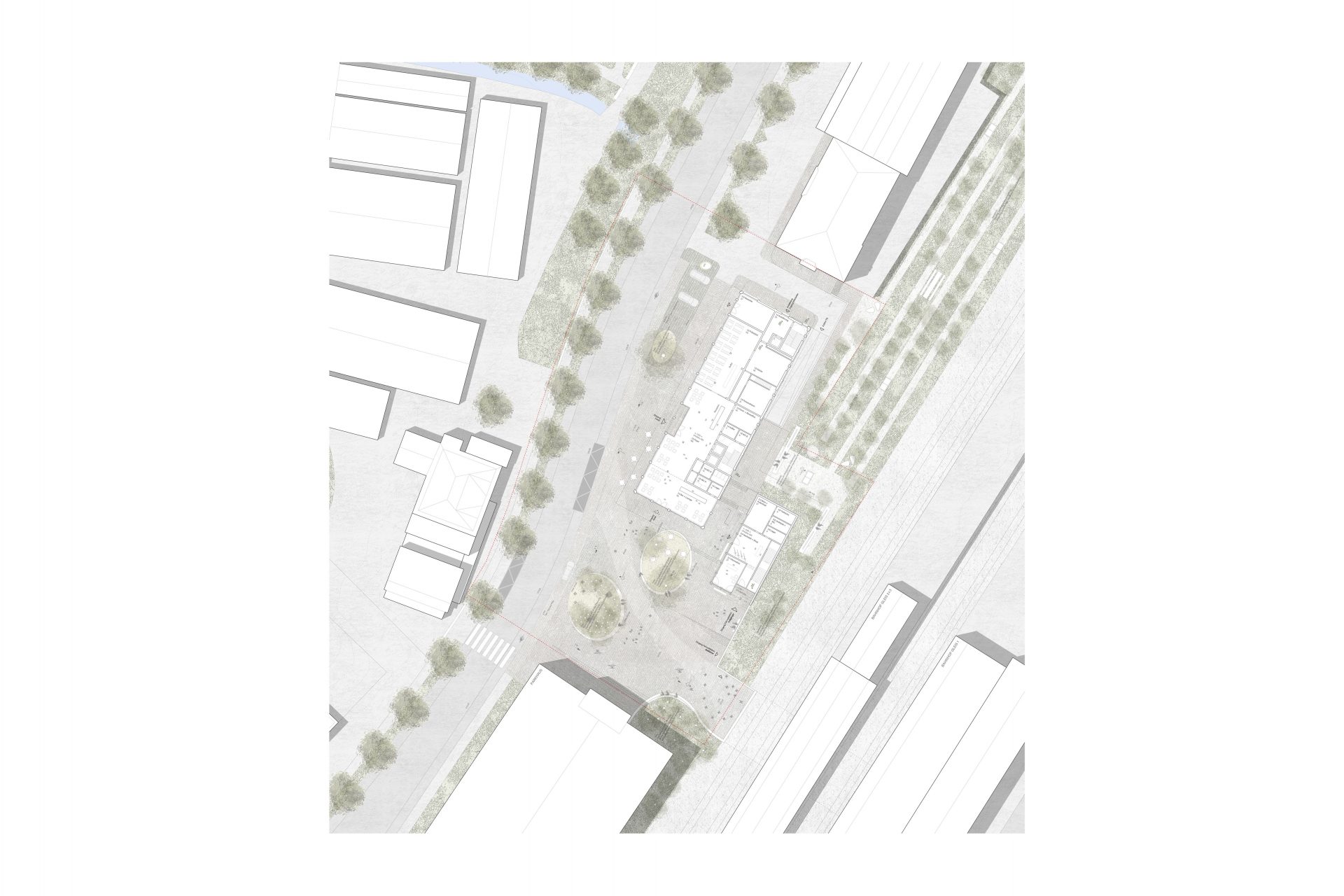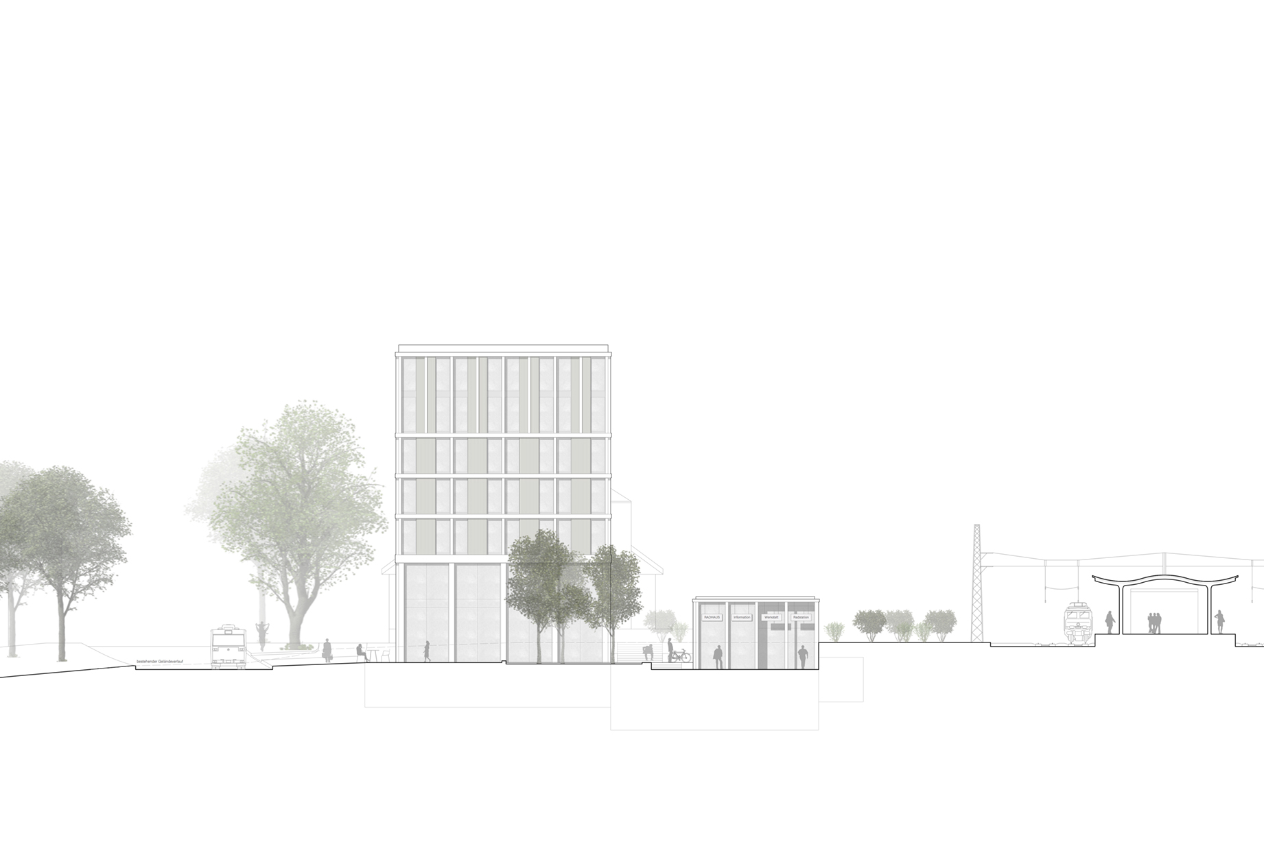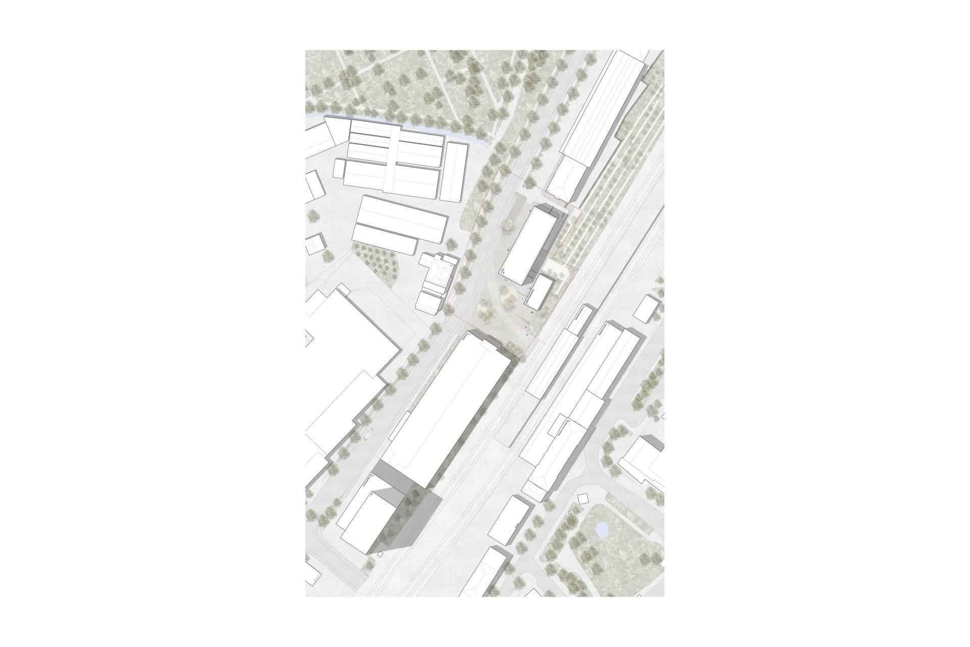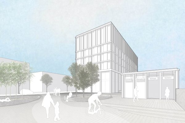Der städtische Platz zum angrenzenden Bahnhof bietet Raum für verschiedene Kommunikations-aktivitäten. Seine Formgebung vermittelt selbstverständlich zwischen den unterschiedlichen Maßstäben und Geometrien des Ortes. Somit entsteht reizvolle Abfolgen von Kommunikationssorten. Dieser Außenraum schafft einen Ort des Aufenthaltes mit einer hohen Qualität, welcher mit den notwendigen Flächen sowie mit verschiedenen Bewegungsprofilen phantasievoll bespielt werden kann.