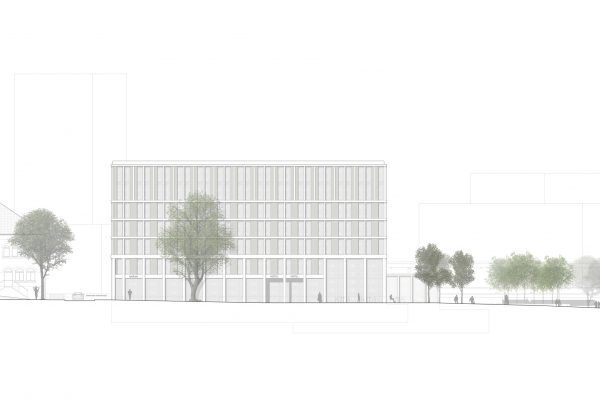 Die Fassade ist eigenständig und in sich vertikal gegliedert. Darüber hinaus orientiert sich in Ihrer horizontalen Ausformung an den Trauf.- und Firsthöhen der umliegenden Gebäude des Zollamtes, des Parkhaus und dem „ Anbau „ des Stuttgarter Tor. Durch optische Zusammenfassung von Geschoßen konnte diese horizontale Gliederung deutlich hervorgehoben werden. Diese horizontale Gliederung manifestiert dadurch die Zugehörigkeit zum diesem Ort.