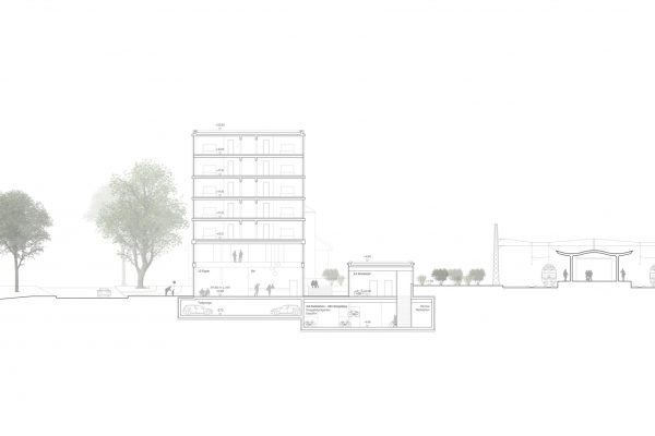 Die Velostation mit Ihren Nebenräumen wurde als eigenständiger oberirdischer Baukörper ausgebildet, der sich faktisch der Formensprache dem Hotelbaukörper anpasst, jedoch nicht unterordnet. Die Velostation beherbergt unterirdisch 460 Stellplätze in Doppel Parker Easylift+ System und ist mühelos auf 800 Fahrradstellplätze erweiterbar. Die Velostation ist über eine Rampe mit entsprechender Zutrittskontrolle gesichert.