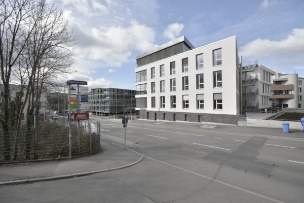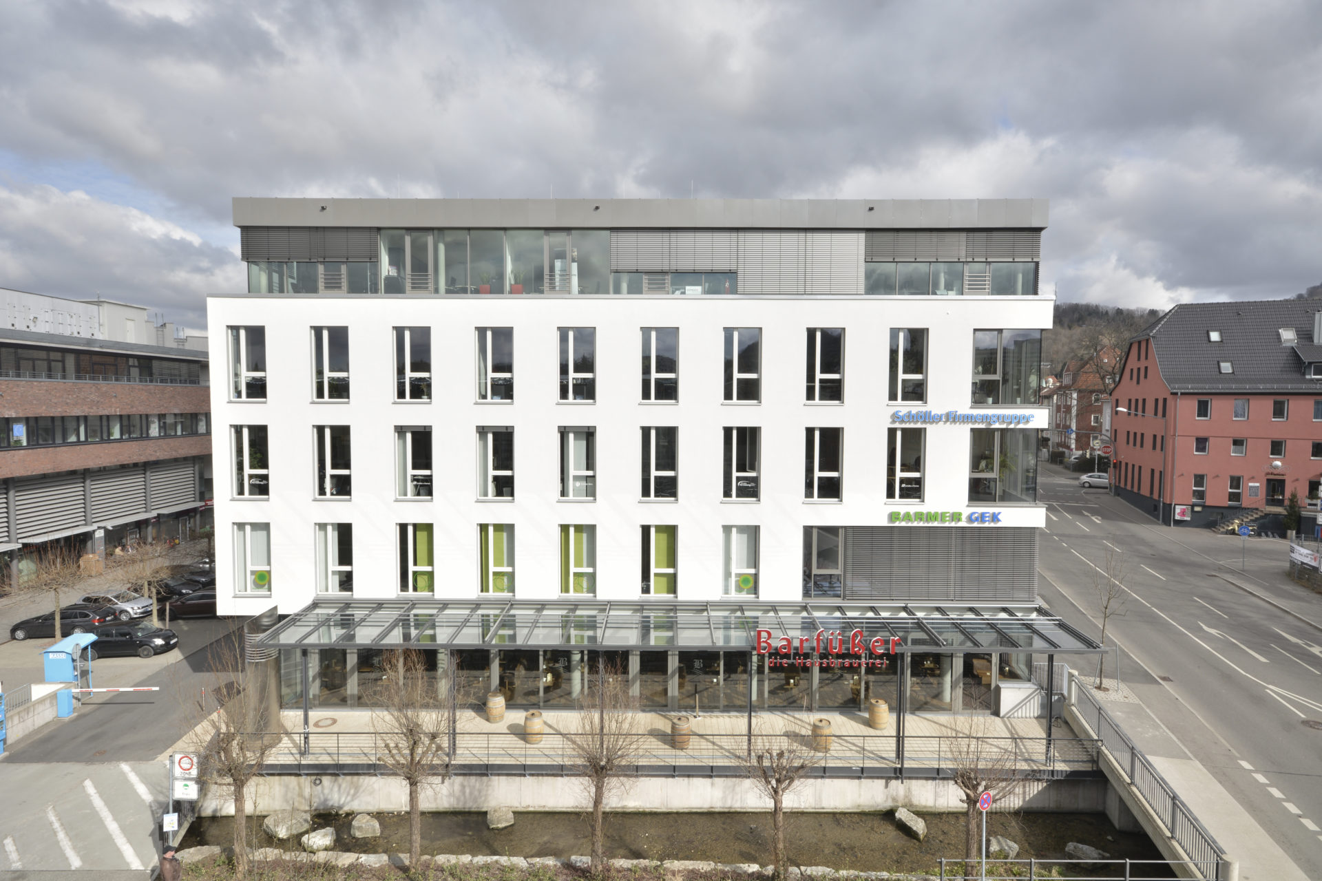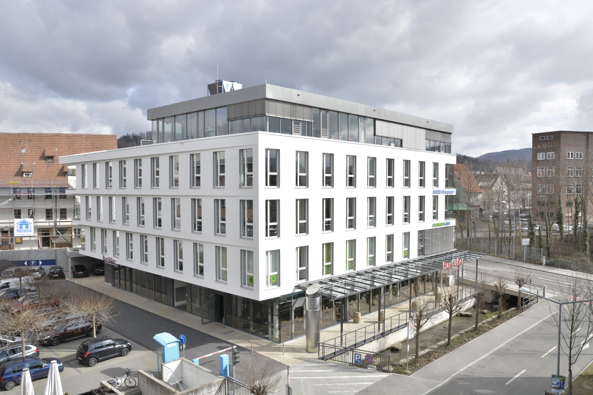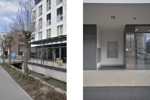 Bei der Obere Wässere 9 handelt es sich um einen 5-geschossigen Geschäftshausbau inklusive zurückgesetztem Attikageschoss. Das Gebäude verfügt über die teilweise Ausbildung eines Untergeschosses. Der Baukörper ist eine Stahl-Betonkonstruktion. Die Fassade besteht aus einer Aluglasfassade im Erdgeschoss und Attikageschoss, sowie einer Putzfassade in den drei Obergeschossen mit Holzfensteröffnungen. Ein innenliegendes, nicht überdachtes Atrium in den Obergeschossen sorgt für die natürliche Licht- und mögliche Frischluftversorgung der Räume zu diesem Atrium hin. Das großzügige Treppenhaus mit Aufzug erschließt alle sechs Geschosse des Gebäudes. Die an der Nordseite zum Grundstück Albstrasse 22 situierte Stahltreppe dient als zweiter baulicher Fluchtweg. Geheizt und gekühlt wird das Gebäude durch eine Luftwärmepumpentechnik auf Multisplittbasis. Gemeinsam mit dem durch ein bauphysikalisches Gutachten entwickelten energetischen Konzept werden durch dieses Haustechniksystem Werte erreicht, welche die Vorgaben der gültigen Energieeinsparverordnung mehr als erreichen.
